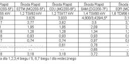 @konry Trzeba by znaleźć 2 chętnych na odpowiednich pojazdach i potem liczyć na ich dobre oko czy odczyt. Jak znajdę chwilę czasu to podam (może i w tabeli) przełożenia w Rapidzie. A jak pójdzie jeszcze lepiej to i prędkości na poszczególnych biegach. Już na dzień dobry: wszystkie przełożenia (do przodu) są praktycznie różne dla każdej wersji. Pozdrawiam