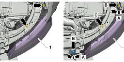 Montaż: Nalezy przeprowadzic w odwrotnej kolejności. Należy zwrócić uwagę na wyrównanie reflektora wg krawędzi karoserii (aby zachować szerokość szczelin), Podłączyć wtyczkę elektryczną, Założyć przedni zderzak, Poprzez obracanie -strzałki- elementów regulacyjnych -A- dochodzi do przesuwania reflektora a tym samym do ustawienia reflektora względem krawędzi karoserii, Następnie dokręcić śruby mocujące -B- (3,5 Nm) i -C- (3,5 Nm)